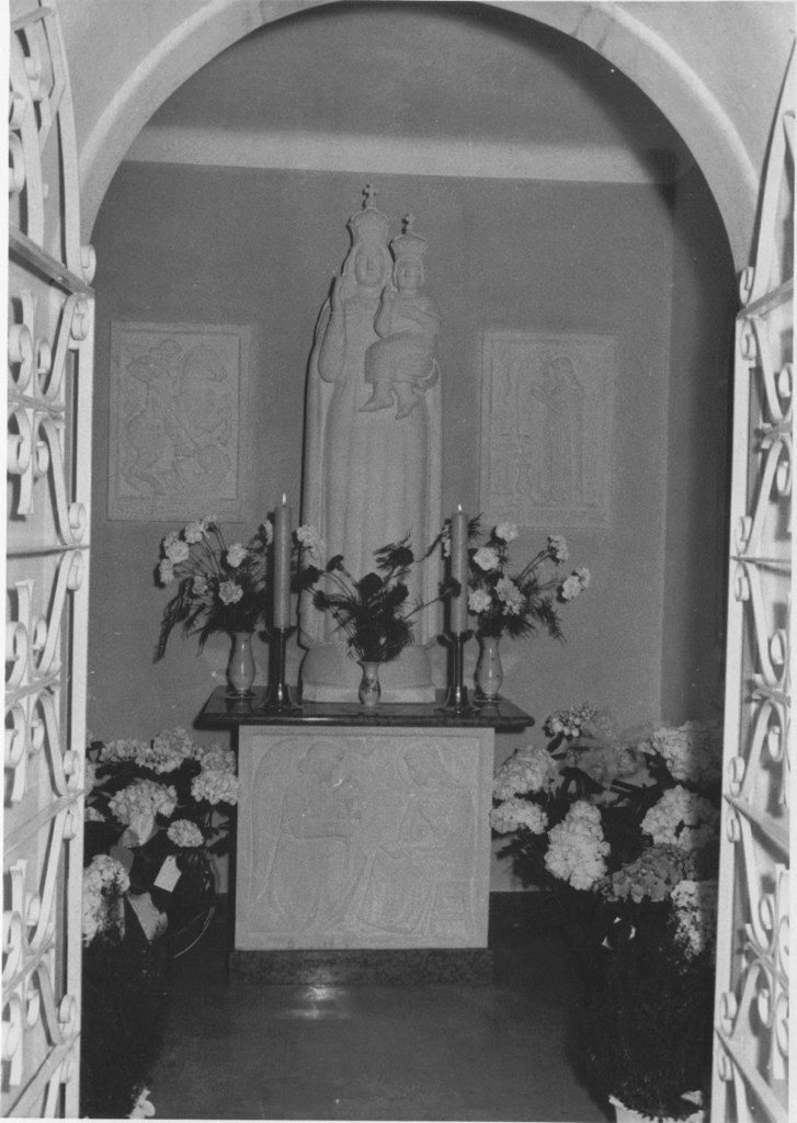 Les portes en fer forgé sont conçues et fabriquées par Georges Molitor. De même les sculptures en pierre blanche à gauche (St. Georges) et à droite (Ste Suzanne) de la vierge.