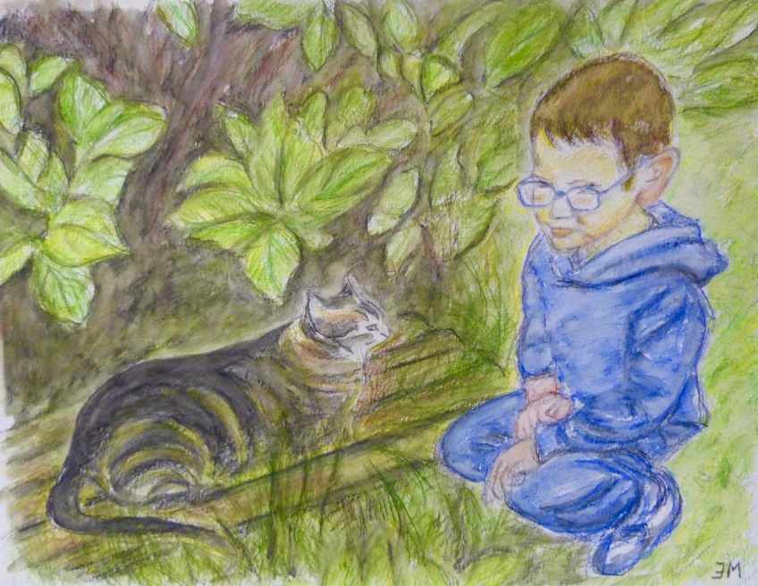 Garçon avec matou Published 18/09/2018 at 2956 × 2289 in Garçon avec matou Lucas avec « Galop » crayons d’aquarelle, 30 x 40 cm, septembre 2018