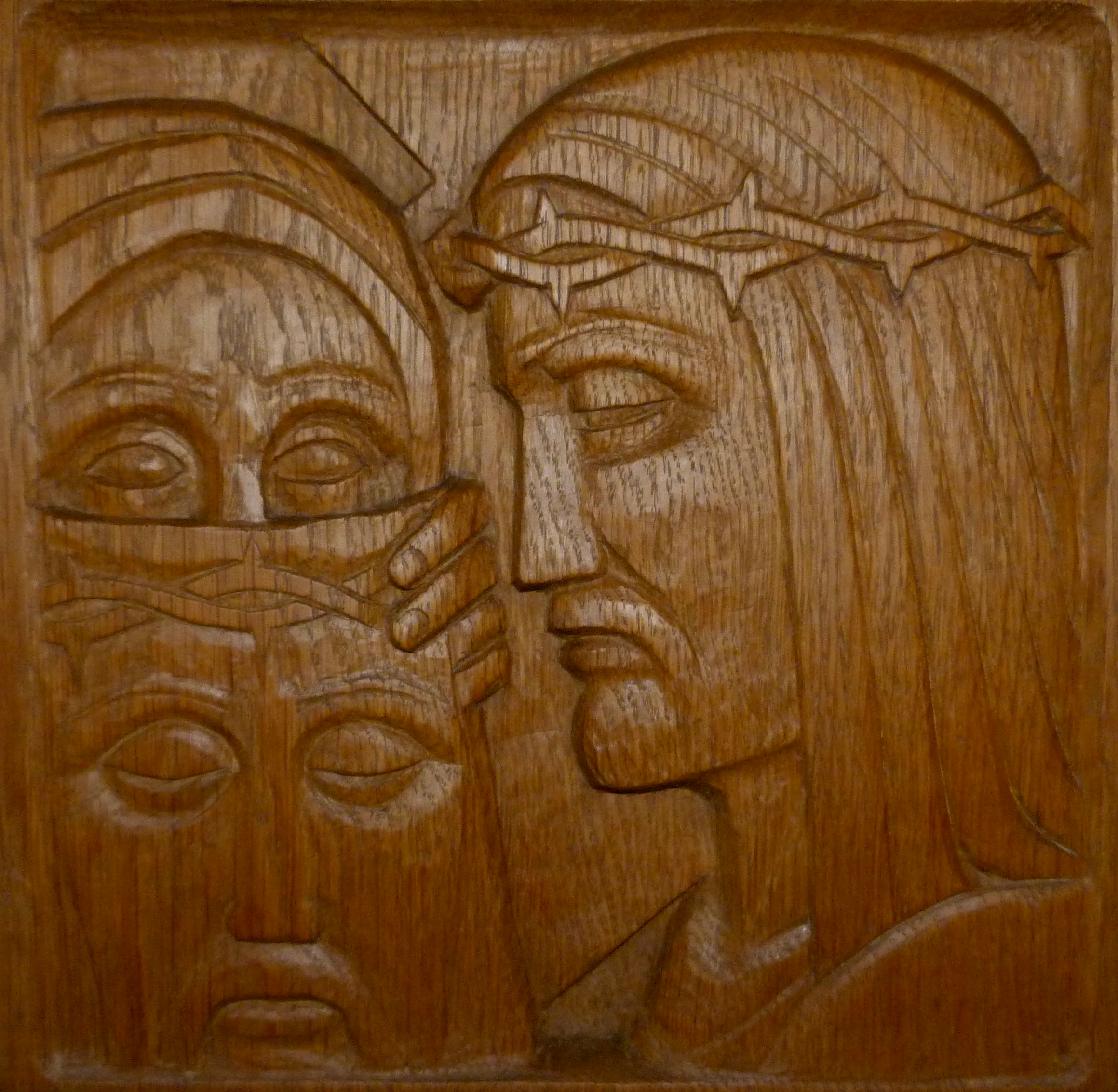 station 6 Published 05/06/2018 at 2319 × 2266 in Chemin de croix, église de Manternach Sainte Véronique essuie le visage de Jésus sculpture en bois 40×40 cm