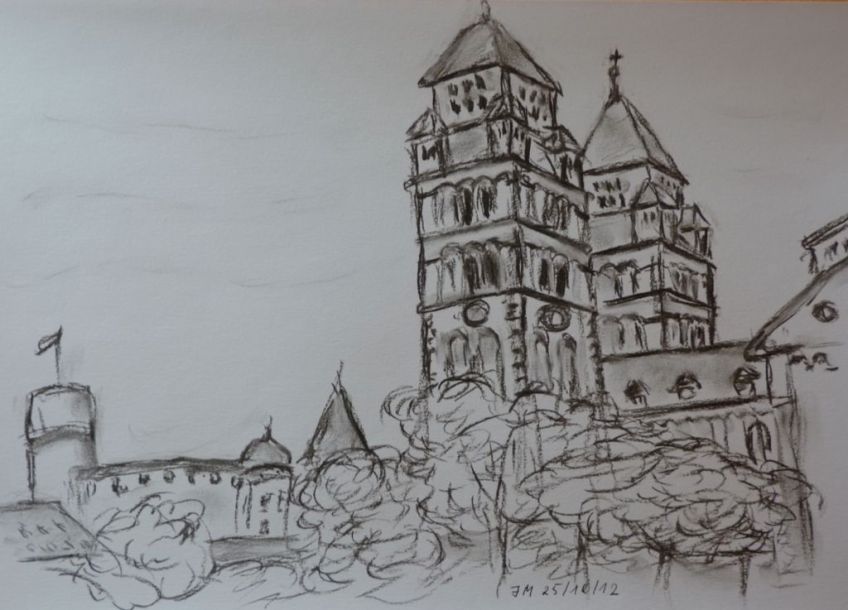 Eglise du Sacré Coeur et château Mayen Published 14/02/2013 at 1024 × 737 in Oeuvres diverses Eglise du Sacré Coeur et château de Mayen (Eifel – Allemagne) charbon sur papier, 29×42 cm, collection privée