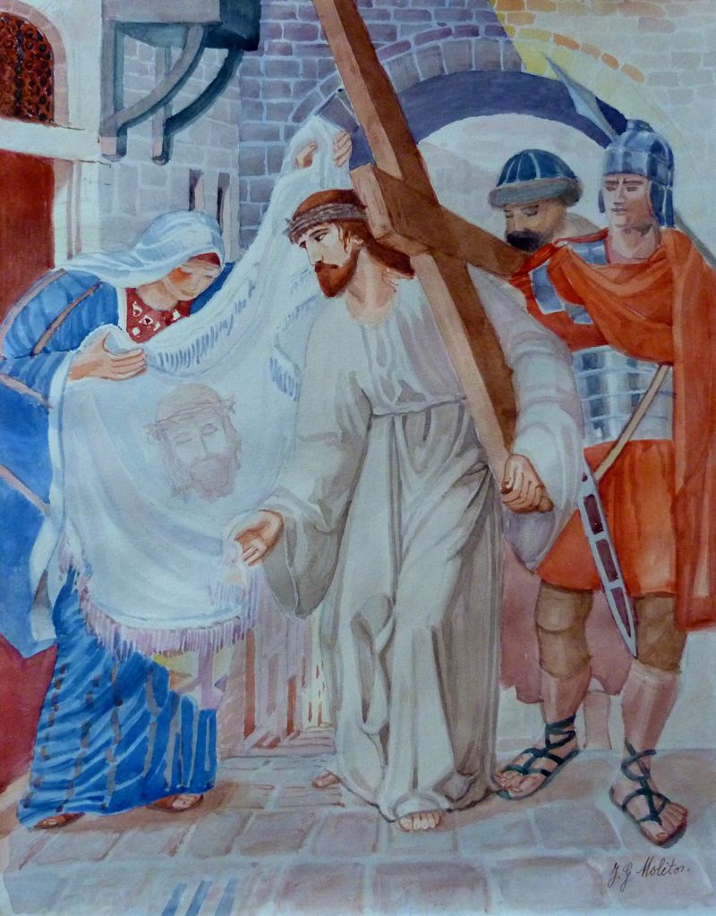 6ème station Published 11/02/2018 at 800 × 1024 in 6ème station Véronique essuie la face de Jésus Aquarelle, 30×40 cm