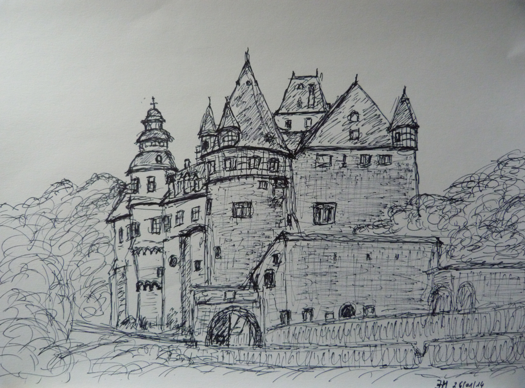 Château de Bürresheim Published 30/01/2014 at 1024 × 758 in Château de Bürresheim Croquis du château de Bürresheim près de Mayen (Eifel – Allemagne) stylo à bille sur papier, 29×42 cm, janvier 2014